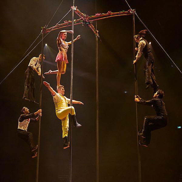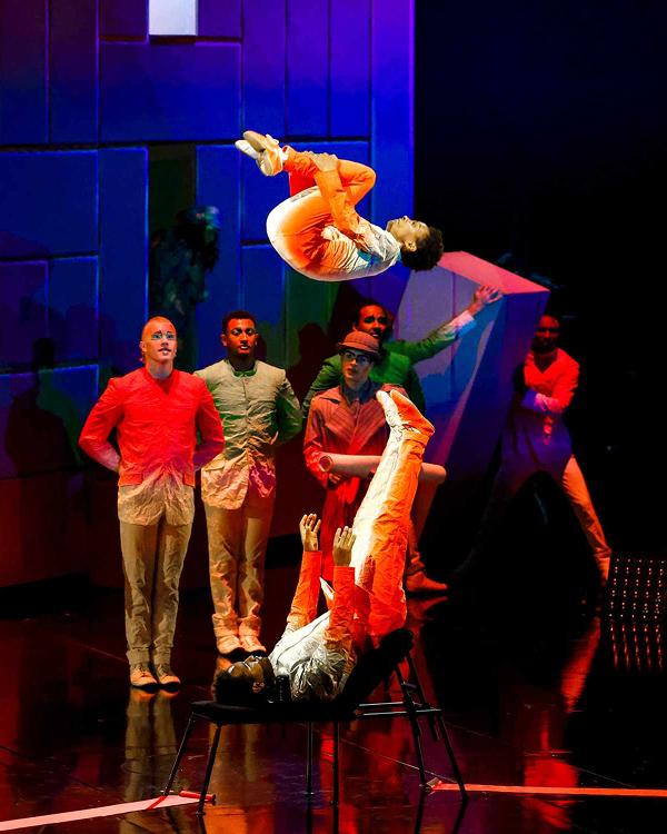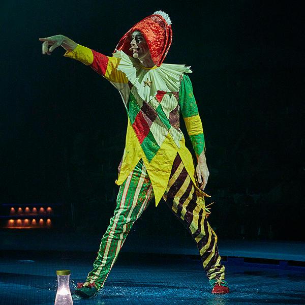 The Visionary reappears, holding his luminous water bottle, carefree and inspired once again. Acrobats soar across the acro net like drops of water, flying to unexpected heights and creating a mesmerizing cascade of energy and motion. The finale bursts with vitality and joy – a celebration of renewal, imagination, and the creative spark reborn.